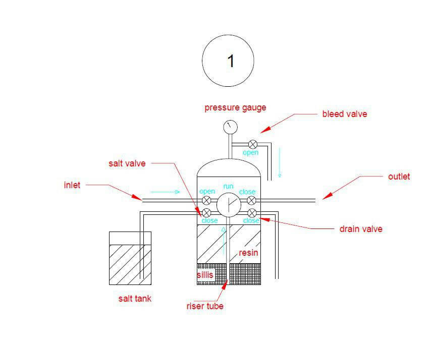 شیر کنترل (دستی یا اتوماتیک) در بالای مخزن قرار گرفته و به خطوط ورودی، خروجی، پساب و آب نمک متصل می‌شود. مخزن نمک در کنار سختی گیر آب قرار دارد و از طریق شلنگ مخصوص به شیر کنترل متصل می‌گردد.
