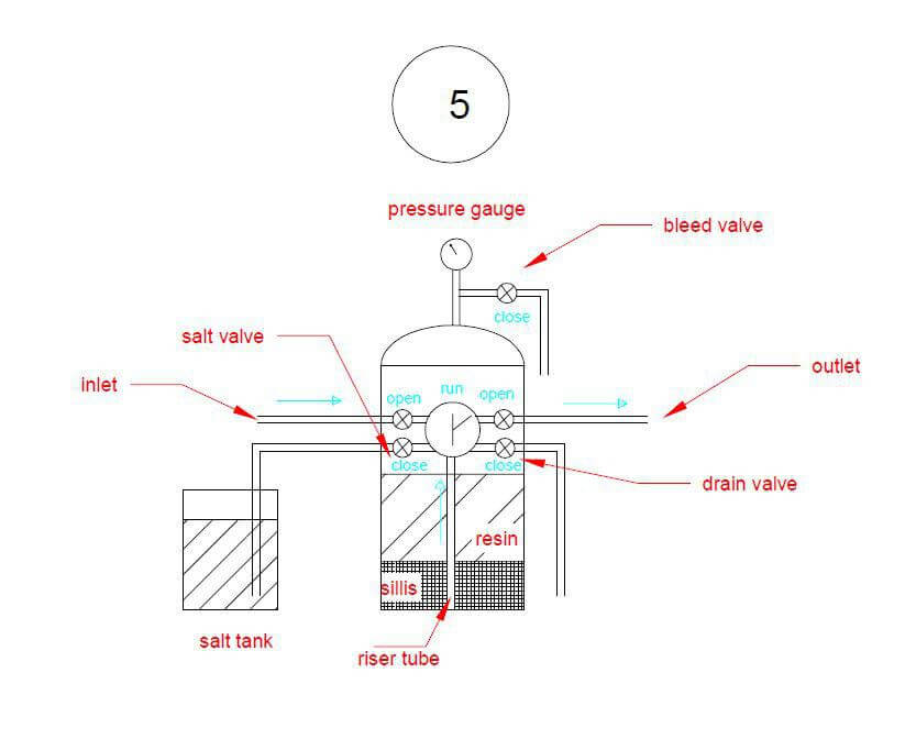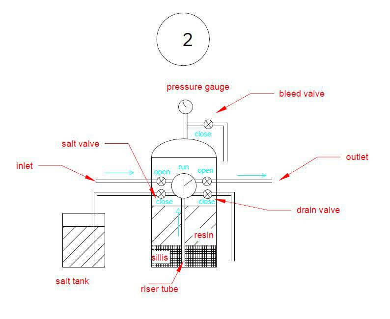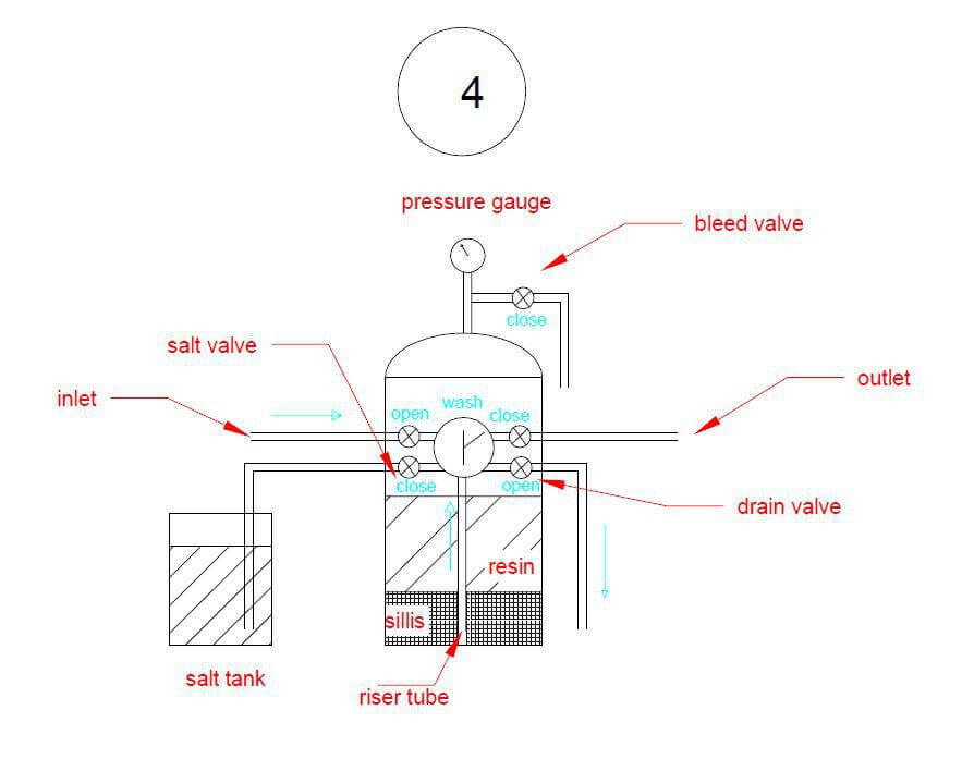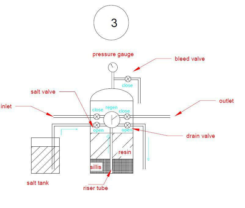3. احیای اولیه رزین: شیر را در وضعیت Brine قرار دهید تا محلول نمک وارد بستر شود و رزین از یون‌های سدیم اشباع گردد (۲۰ تا ۳۰ دقیقه).