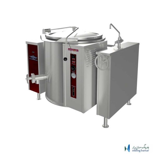 - دیگ خورشت پز کج شونده یا پاتیل چرخشی: این دیگ ها دارای یک مکانیزم مکانیکی یا هیدرولیکی برای تغییر زاویه مخزن هستند. در این مدل، کل مخزن دیگ حول یک محور می چرخد و به سمت جلو خم می شود. این ویژگی برای تخلیه خورشت های بسیار غلیظ (مانند حلیم یا آش) که به راحتی از شیر تخلیه عبور نمی کنند، عالی است. همچنین هنگام نظافت، اپراتور می تواند دیگ را کاملاً خم کند تا تمام آب و مواد شوینده به راحتی خارج شود.